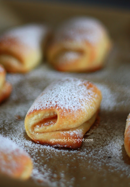 Pakilusią išsiversti ant lengvai miltuoti stalo, padalinti į 2 dalis ir šias iškočioti į stačiakampius. Aptepti likusiu sveistu (lydytu), užbarstyti cinamoniniu cukrumi, kiekvieną tešlos stačiakampį supjaustyti į 10 mažų dalių ir šias sulankstyti į tris dalis. Padėti kilti. Man kažkodėl sunkiai kilo, bet po 1 val pašoviau ir pastebėjau jog orkaitėj jos vis dėlto puikiai iškilo.